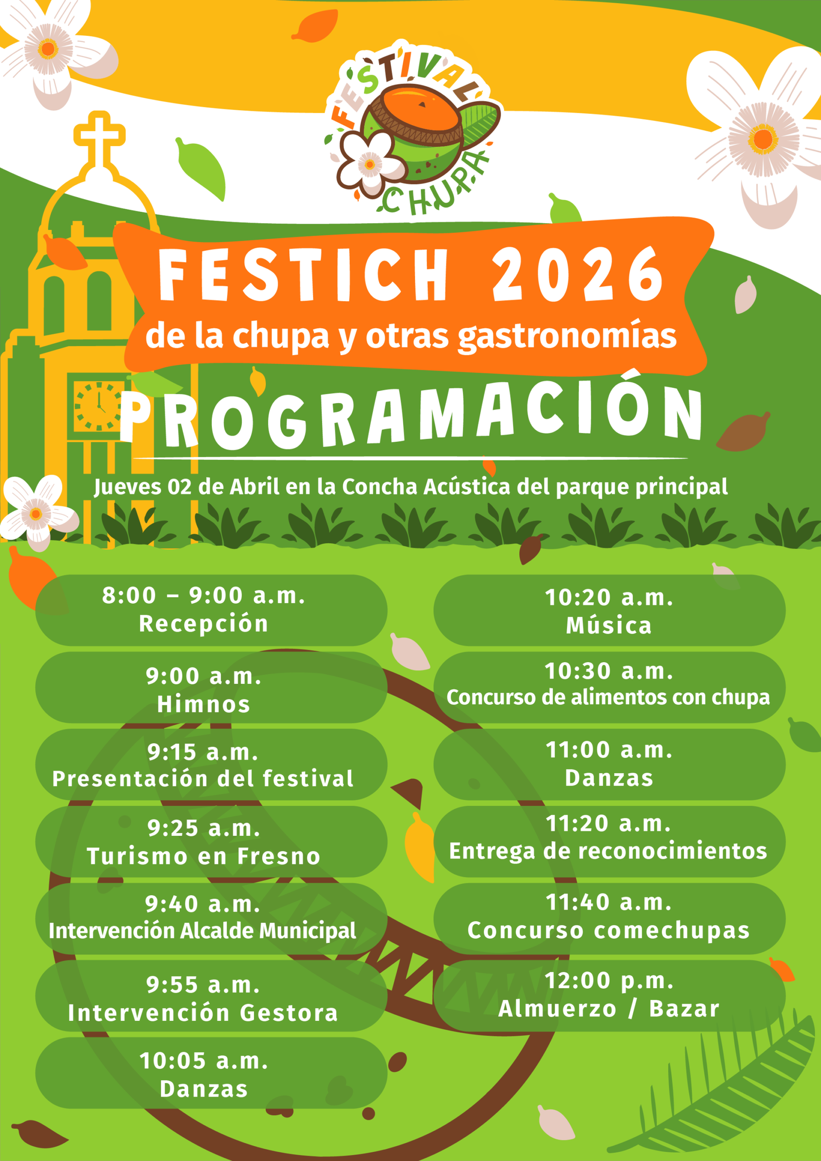 Este jueves 02 de abril te esperamos en la Concha Acústica del parque principal de Fresno, Tolima, para vivir una jornada llena de cultura, gastronomía y tradición alrededor de la chupa.